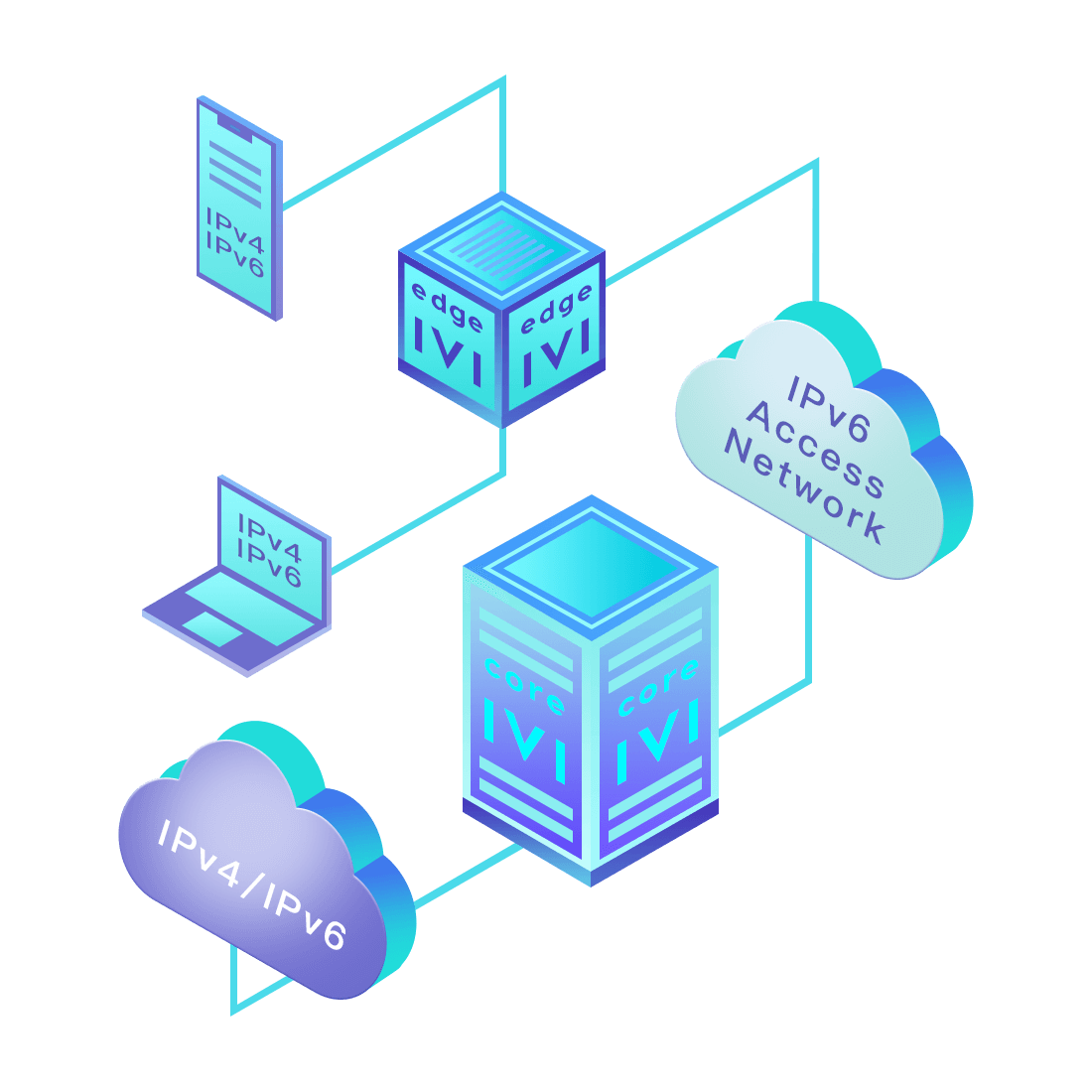 對正在進行IPv6整體升級規(guī)劃的運營商,應用IPv6升級方案2.5,通過IVI無狀態(tài)翻譯技術和純IPv6接入網(wǎng)絡,為雙??蛻舳撕碗p棧服務器提供連通服務。